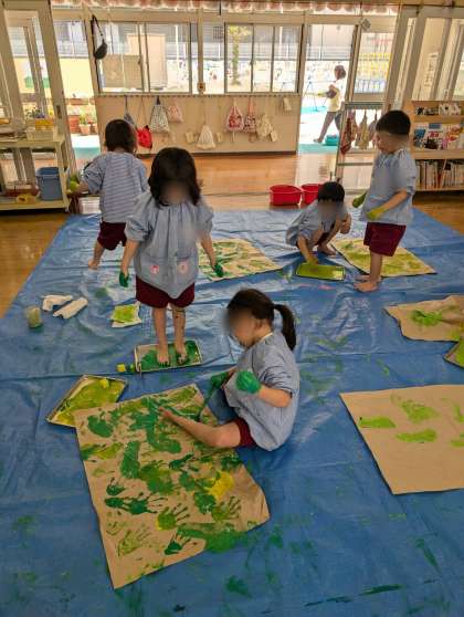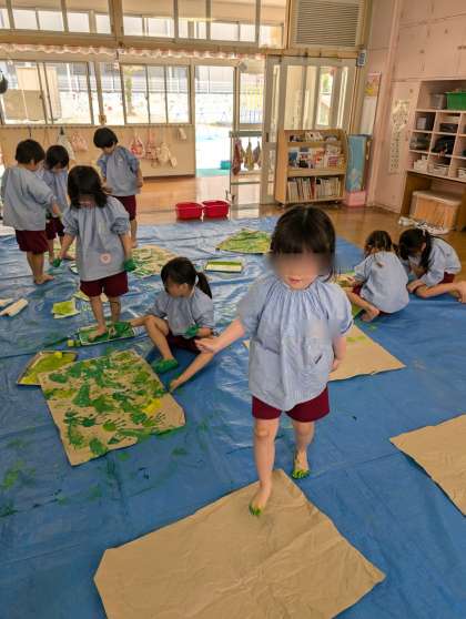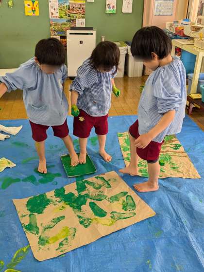 そら組が絵の具で手形や足形を押して遊んでいました。始めは遠慮がちにそーっと手形を押したり、スポンジを使ったりしていたそら組さんですが、だんだん大胆になってきて、途中からは全身を使って絵の具で遊んでいました!絵の具の感触も楽しんでいたようです。「楽しかったー」の声も聞こえてきました。