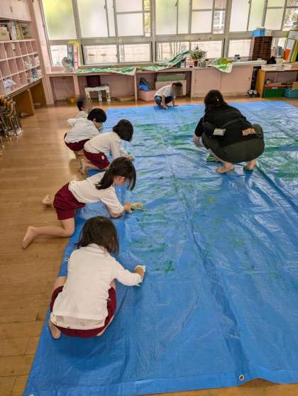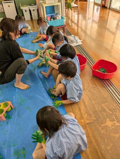 全身で思い切り絵の具遊びをしたそら組さん。終わったあとはお片付け。