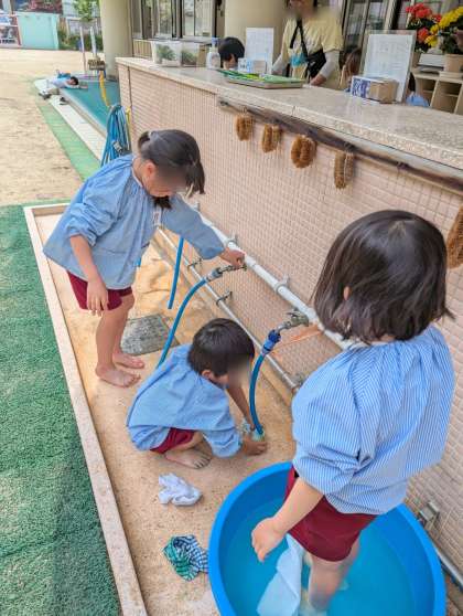 まずは足を拭いて、洗いました。その後、全員でシートもきれいにしました。最後までしっかり拭いていました。