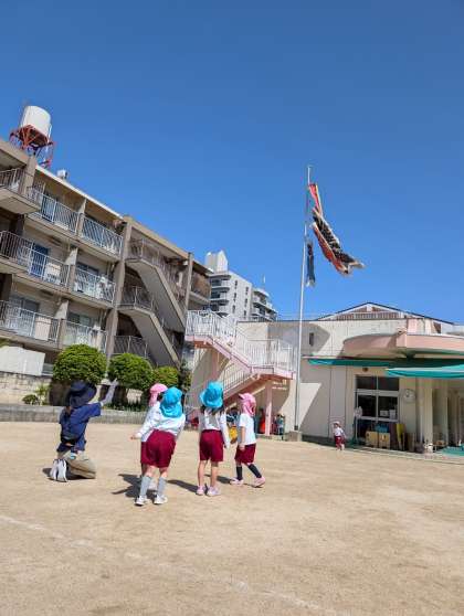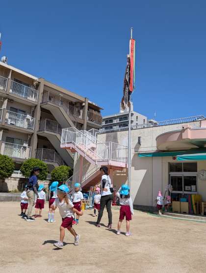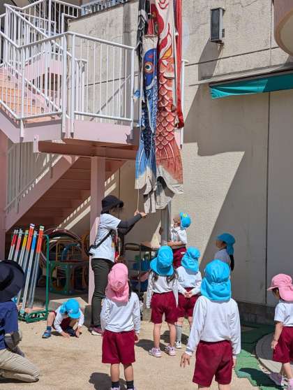 みんなでこいのぼりをあげました。「♪やねよ〜り〜た〜か〜い、、」と、歌いながら上がっていくのを見ていました。「離れたほうがよく見えるよ!」と少し離れていきました。風が吹いてこいのぼりが泳ぎ出して、みんな大喜びでした。