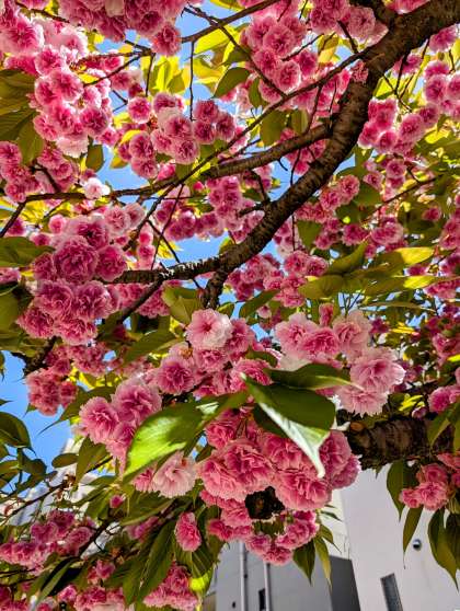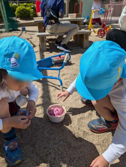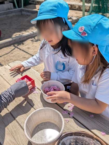 園庭の八重桜が満開です。落ちたお花をみんなで拾っていました。「きれいやなあ」「いっぱい落ちてる」とカゴいっぱいに拾って嬉しそうでした。