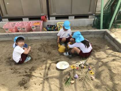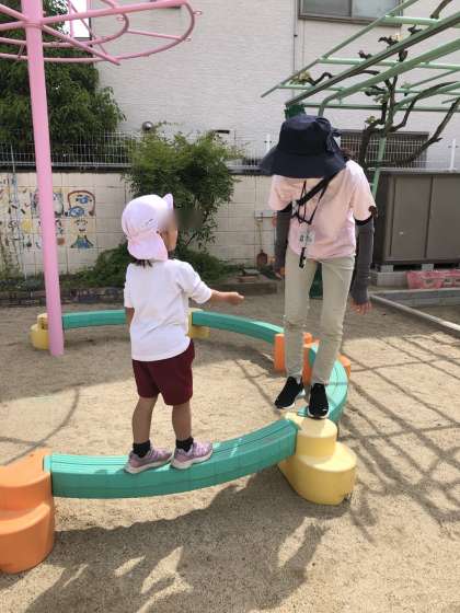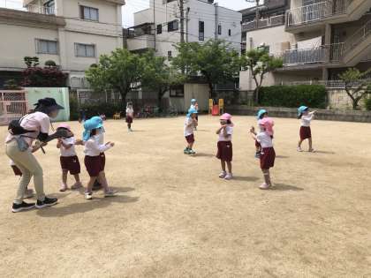 今日もみんな園庭で元気に遊んでいました。片付けのあとは一緒に体操。繰り返ししていくことで少しずつ自信をもってできるようになってきました。