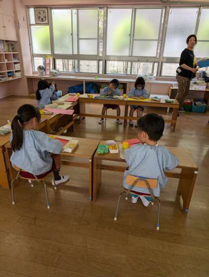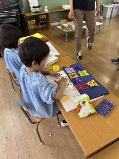 そら組さんは切り紙をして、こいのぼりを作っていました。折った折り紙を色々な形に切って広げると、、綺麗な模様ができて居ました!みんな大喜び!何枚も切ってできる模様を楽しんでいました♪