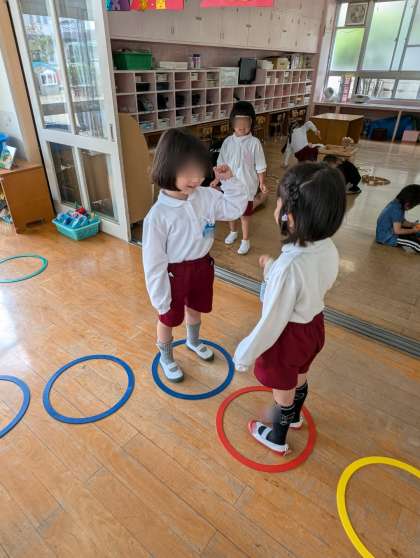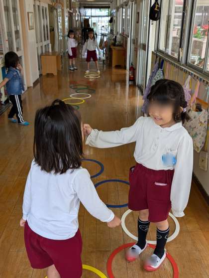 廊下にフープを並べてジャンケンゲーム!もも組さんも興味をもって「いれて!」「私もやりたい!」と来ていました。たくさん一緒に遊べて楽しかったですね。