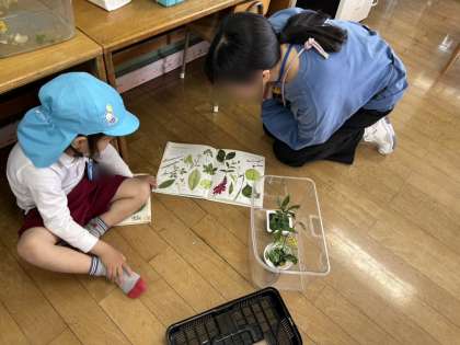 葉っぱについていた青虫を発見。図鑑を見ながら、どんなチョウの幼虫かを調べていました。アゲハの卵も見つかりました。幼稚園のお庭にチョウがいっぱいきてくれると嬉しいですね!