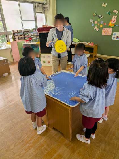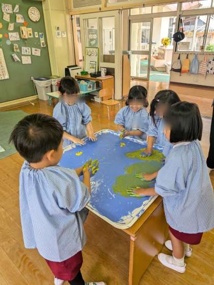 もも組が「あおくんときいろちゃん」のお話からフィンガーペイントで遊んでいました。絵の具の感触を楽しんで塗り拡げたり、指で線をかいたりして存分に楽しんでいました。途中から「きいろちゃん」も登場!「色変わった!」「緑になった!」と混ざると色が変わることに気づき、大喜びでした。