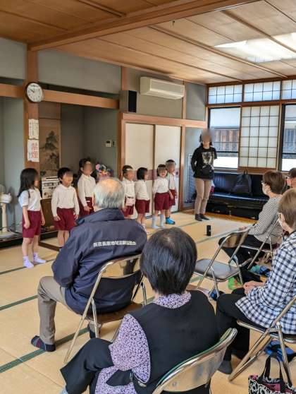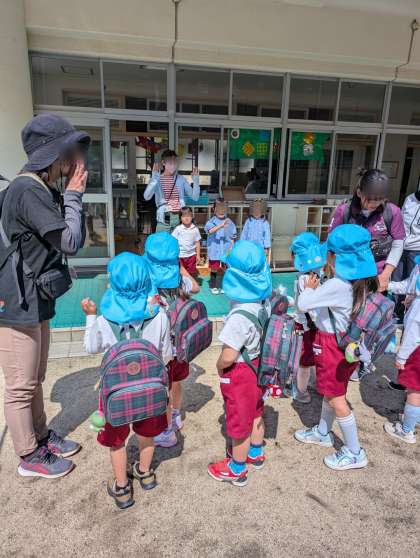 今年度、1回目のいこいの家訪問!そら組さんの出発をもも組さんが見送っていました。そら組さん、しっかり並んで歩くのもバッチリ!地域の方の前でも堂々と歌っていました。