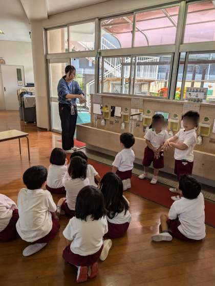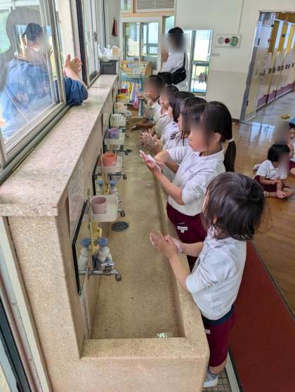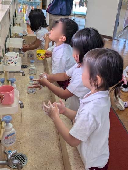 養護教諭が実際に石鹸をつけて、洗い方を知らせていると「なんかやりたくなってきた」と子どもたちから声があがりました。もも組もそら組もみんなで手洗いうがいをしていきました。ピカピカになりましたね!