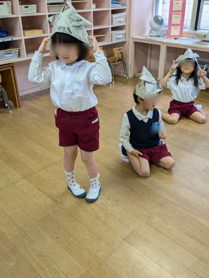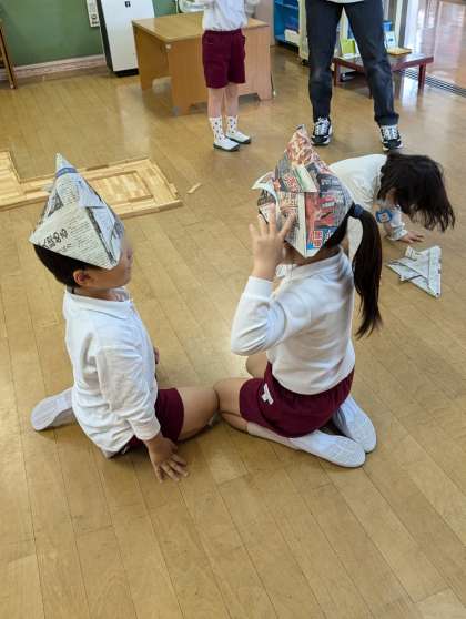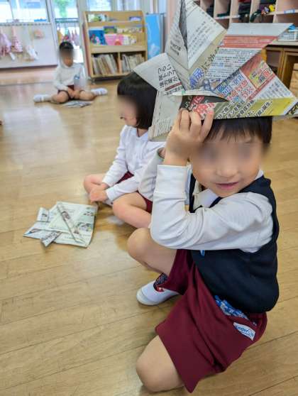 集いの後そら組さんが新聞紙でかぶとを折っていました。折り方をしっかり聞いて頑張っていました。完成したものをかぶって嬉しそうでした!