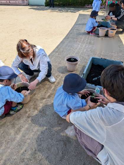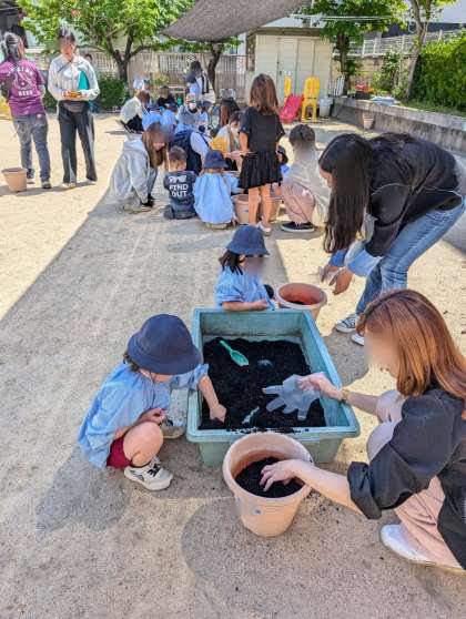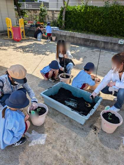 お家の方と夏野菜の苗を植えました。ミニトマト、ピーマン、オクラ、、、はやく大きくなりますように。しっかりお水もあげて、お世話をしていきましょうね。保護者の皆様、ご協力ありがとうございました。子どもたちと一緒に生長や収穫を楽しんでいただけたらと思います。