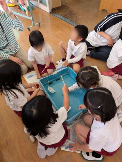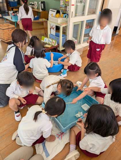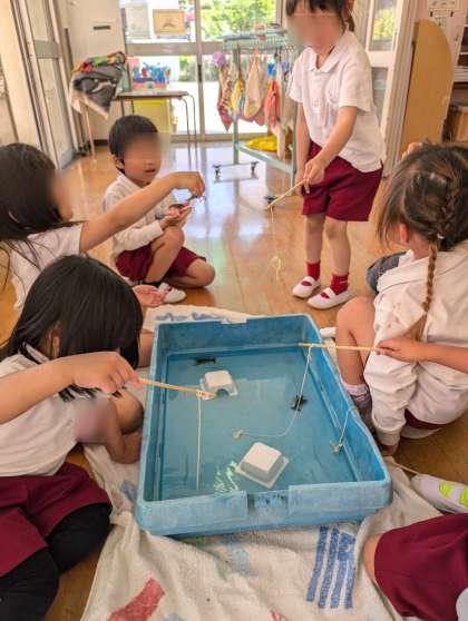 ザリガニ釣りを楽しんでいました。釣るためには慌てずそーっと待つんだよーとそら組さんが、教えてくれていました。