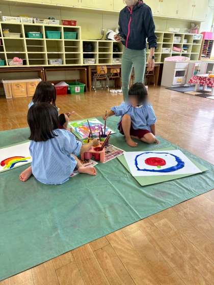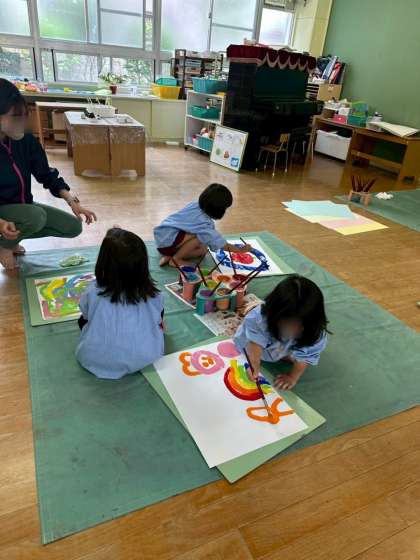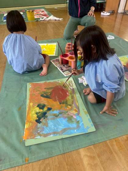 もも組さんが絵の具で絵をかいていました。好きな色を使って、自由に伸び伸びとかいていきます。色が混ざることも、楽しかったようです。