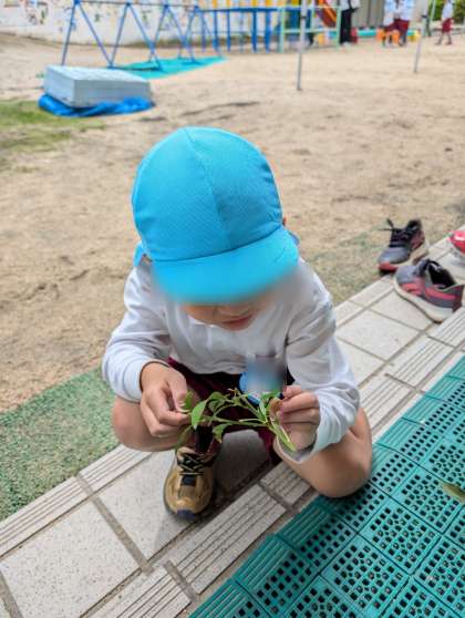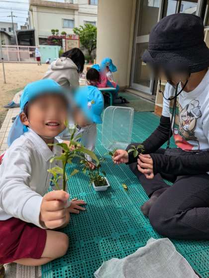 金曜日に見つけたアゲハの幼虫、葉っぱをたくさん食べて大きくなってきました。大切にお世話をしています。