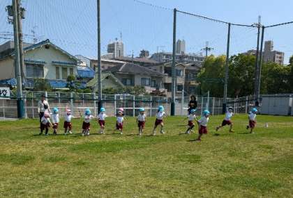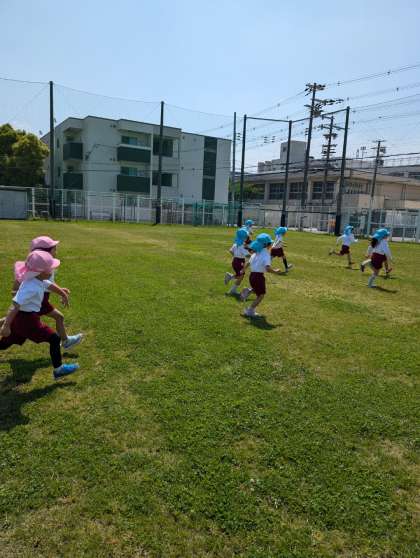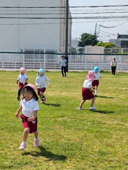 仲良し遊びをしたあとはみんなで「よーいどん!」力いっぱい走っていました。広い場所で思い切り走るの気持ちよかったね♪
