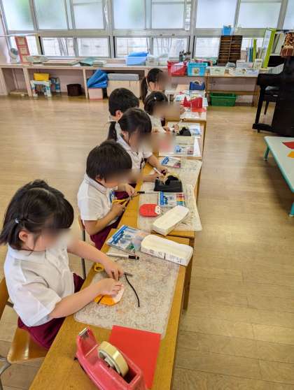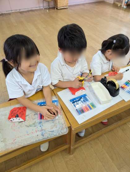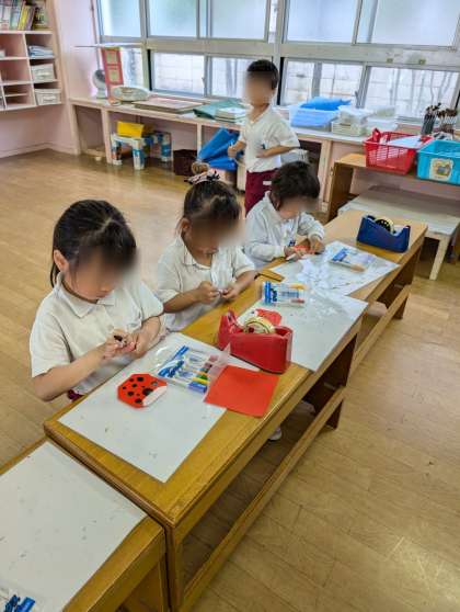 お庭で虫探しをしているそら組さん。毎日探していますがなかなかテントウムシがやってきてくれません。そこで、先に折り紙で作って、テントウムシを呼ぶことにしました。可愛いテントウムシたくさんできたよ。遊びにきてねー!!