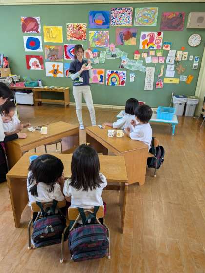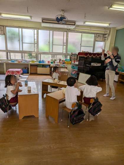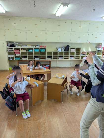 もも組さんはお弁当の後、みんなで歯みがきタイム。先生がもっている大きな歯を見ながらしっかり歯みがき。丁寧にみがいていました。