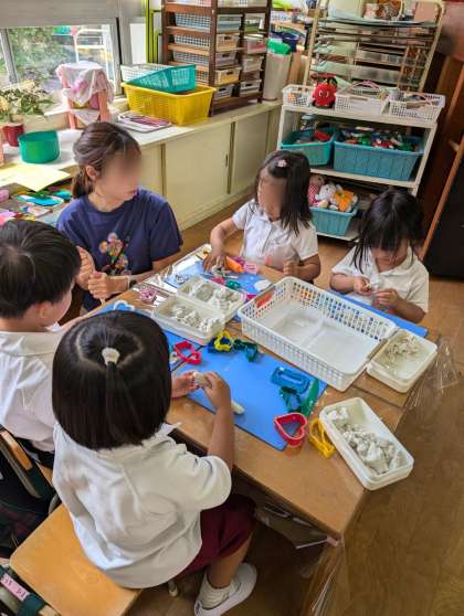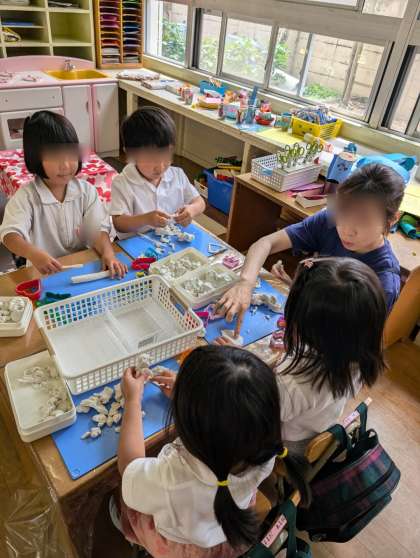 もも組さんが粘土で遊んでいました。ごちそうを作ったり、カタツムリの家族を作ったりして楽しそうでした。お部屋でのお気に入りの遊びの一つですね。