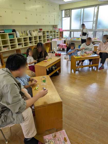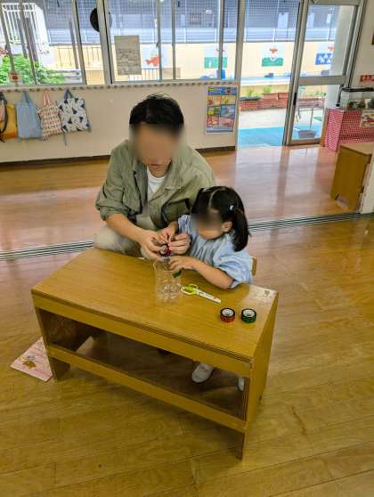 もも組さんは「水遊びのシャワーをつくろう」と、お家の方に「穴あけ」をしていだいて、自分だけのシャワーを完成させていきました。テープやペンを使って楽しみながらつくっていました。