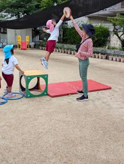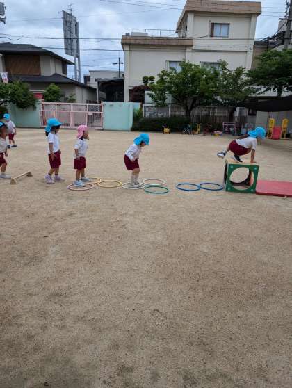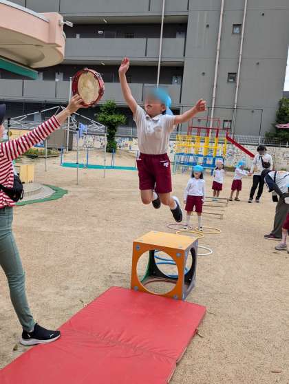 コースを作ってサーキット遊びをしていました。カラーボックスから大きくジャンプしてタンブリンにタッチ!!体を存分に動かして楽しそうでした。
