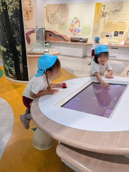 お弁当のあとは自然史博物館にいきました。大きなワニや恐竜の骨にびっくりしたり、いろいろな生き物の展示を見たり、遊んだりして楽しんでいました。