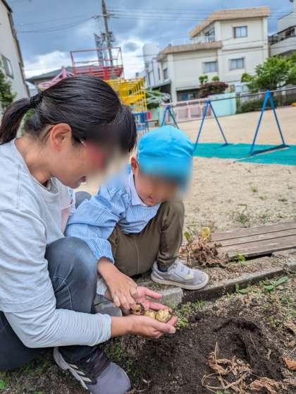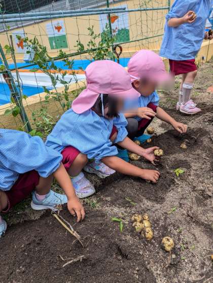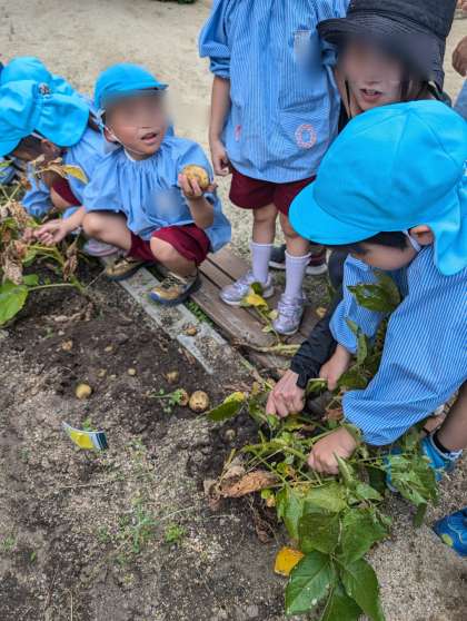 昨年植えたジャガイモが大きくなってきました。ジャガイモはどこにできるでしょう?と子どもたちに聞きながら、掘っていきました。土の中から沢山のジャガイモがころころとでてきました!「あったー!」「おっきいの見つけた!」「いっぱいできてる」と夢中で掘っていました。