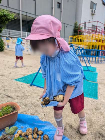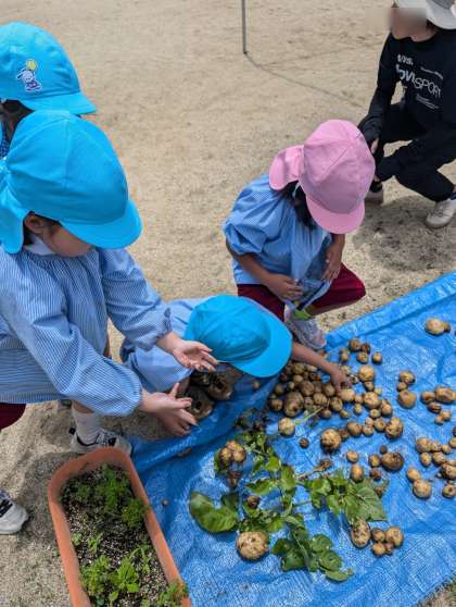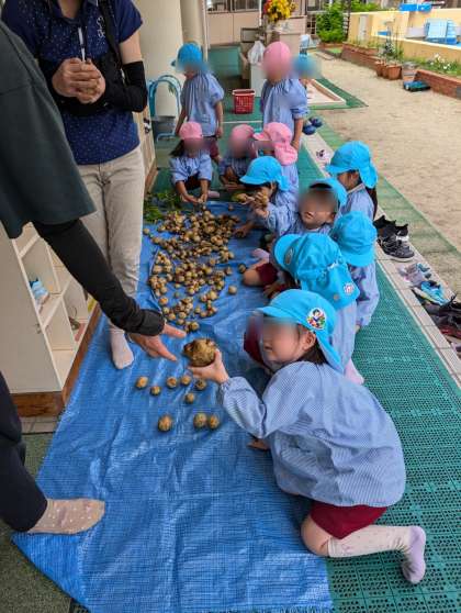 掘ったおいもをみんなで運びました。色々な大きさがあるね。いっぱいとれたね。でもね、緑色になってるやつは残念ながら食べられません。緑色になってるのないかな?大丈夫かな?みんなで調べていました。