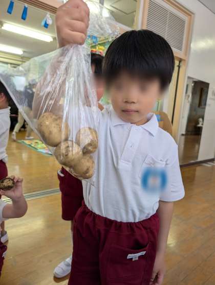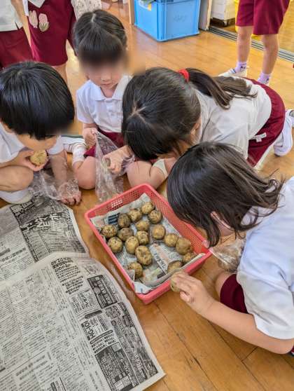 みんなで掘ったジャガイモはもちろんおみやげです♪「いっぱいあったね」「はやく持って帰りたい!」と期待でいっぱいの子どもたちだったので、すぐにおみやげにする用意をしました。好きなおいもを自分で選んで、全部でいくつあるかな?