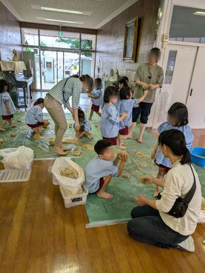 今日はそら組さん、もも組さん一緒に土粘土で遊びました。足でふんだり、伸ばしてみたり、道みたいにのばしたりもしました。水をつけるとぬるぬると滑ることも気持ちよかったようです。