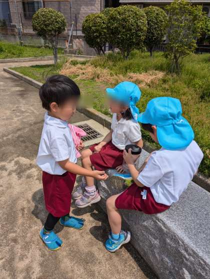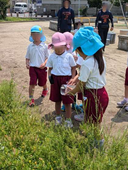 公園では沢山のチョウが飛んでいました。みんな帽子や、ケースを使って見事につかまえていました。びっくり!!じっくり見て、「ちょっと色がちがうね」「めっちゃ元気やな」とうれしそうでした。