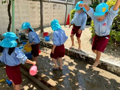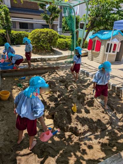 そら組さんは今どろんこ遊びが盛り上がっています。遊び方もだんだんダイナミックになってきて「先生ー見てー!(ズボン)濡れた!!」「靴ぬいだら入っていいで!ここめっちゃ深いから」と嬉しそうに教えてくれます。今日はさらにどろんこにジャーンプ!!楽しそうですね。