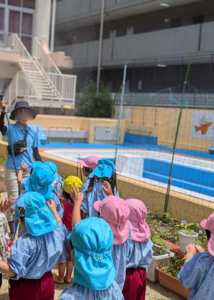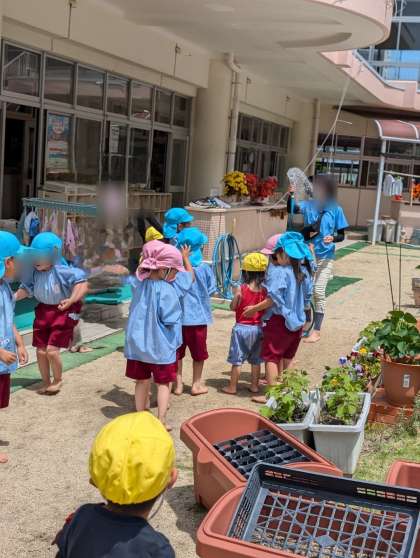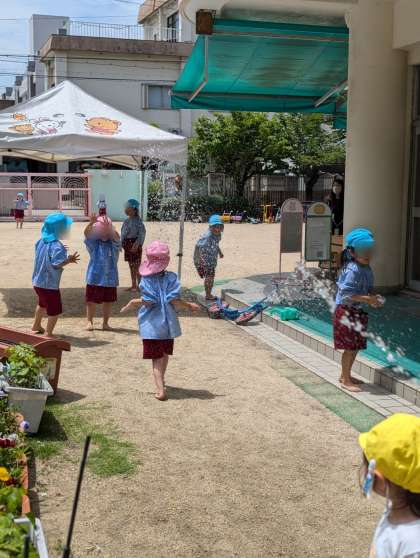 とても暑かった金曜日、水遊びの時にシャワーも登場!子どもたちが「きゃーー!!」と笑いながらどんどん先生の方に行ったり、走って逃げたりして楽しんでいました。暑い中、気持ちよかったのかな?「もう1回!」コールが何度も繰り返されていました。