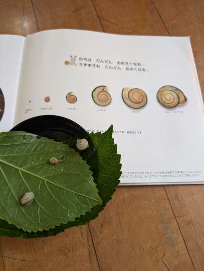 幼稚園に小さいまだまだ赤ちゃん?のカタツムリがきました。「小さい!可愛いなあ」と興味津々。絵本で比べてみると、、生まれて6カ月〜1歳くらいかな?大きくなあれ!