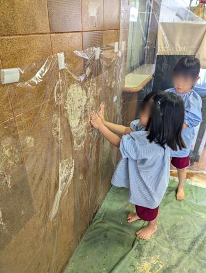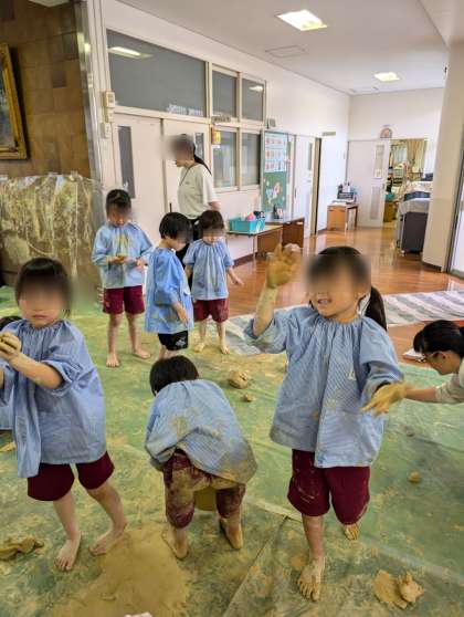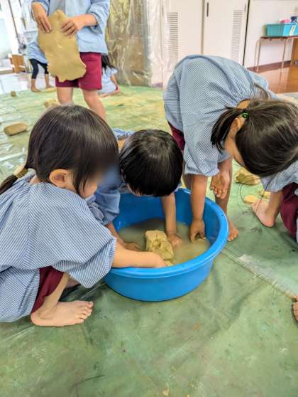 朝から雨で、園庭にはいけませんでしたが、土粘土で思い切り遊びました。水をつけるとぬるぬると滑る感触を感じたり、平べったく広げていくことを楽しんだり、、、全身を使って遊んでいました。