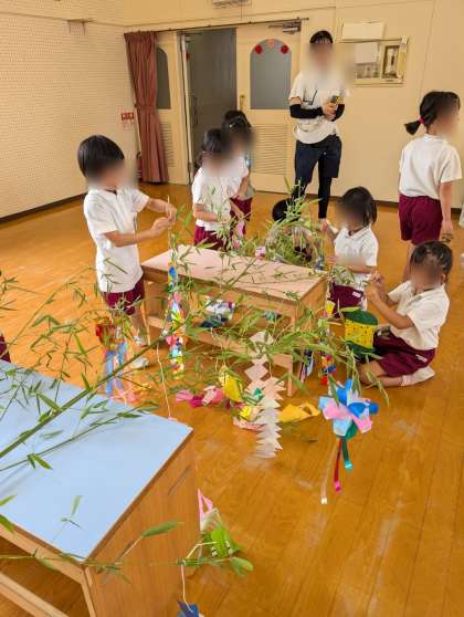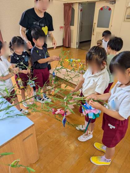 リズム室で、幼稚園用の笹飾りをつけました。こよりを結ぶのも一人ひとり頑張りました!飾りがついた笹を見て「きれいー」「大きい!」と大喜び。「七夕さま歌いたい」と、声があがり、最後に、みんなで七夕さまを歌いました。