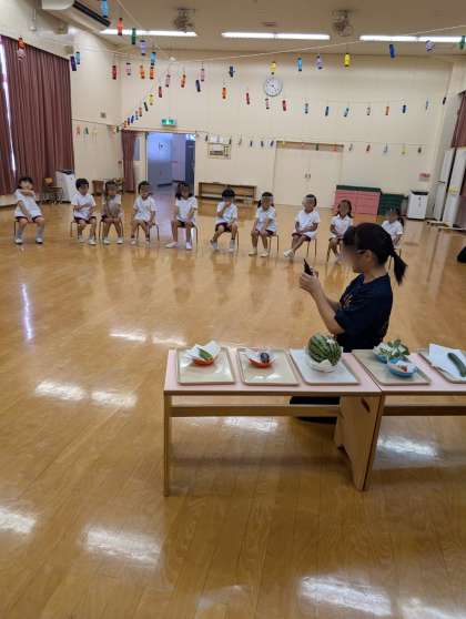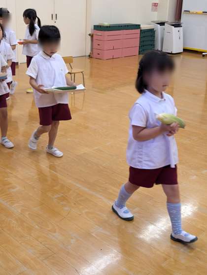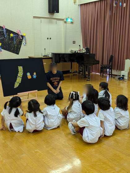 七夕の集いをしました。そら組さんがお供えを運んでくれました。お供えや笹飾りを見たり、パネルシアターで七夕のお話をきいたりしました。