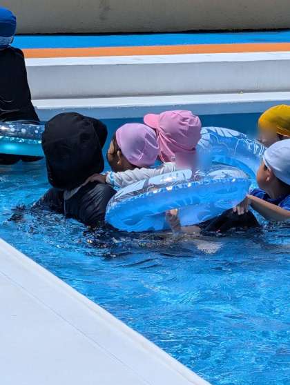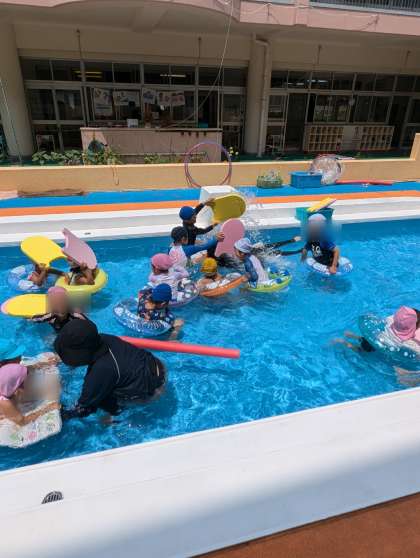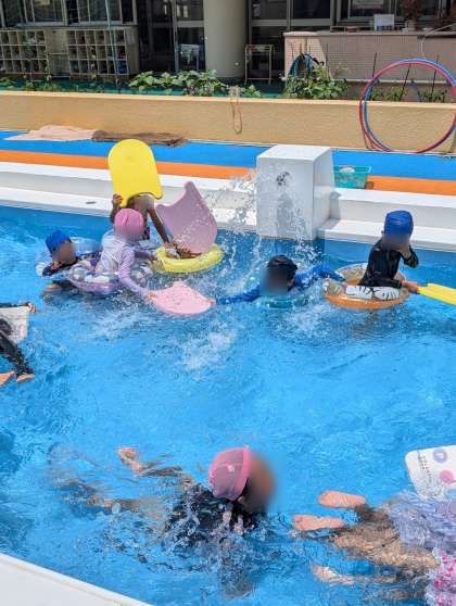 プール開きから、少し天気の悪い日もありましたがそれ以外は毎日元気いっぱいプール遊びを楽しんでいます。水にも慣れてきて、少しずつ顔をつけたり、バタ足をしたりとチャレンジする姿も見られています。