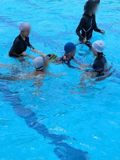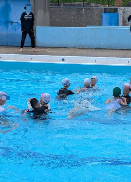 川辺小学校の5年生とプール交流をしました。(保護者の皆様小学校前までの送り迎えのご協力ありがとうございました。)5年生のお兄さんお姉さんが優しくかかわってくれて、子どもたちはとても嬉しそうでした。広いプールでのびのびと遊ぶことができて楽しい時間となりました。