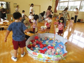 保護者の方がスーパーボールすくいや魚釣りなどいろいろなお店を準備してくださいました。当日、子どもたちは朝から「何屋さんがあるんだろう?」とお祭りの始まりにワクワクしていた様子でした。