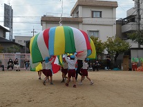1学期から海のイメージで船を作って遊んできたそら組の子どもたちは、船に乗って冒険に出かけることにしました。竹馬や一本歯下駄、フープやアオムシペダルなど自分で挑戦したい遊具を決め取り組んできた姿も冒険の中で披露しました。虫が大好きなもも組もバッタになり自分で作った元気玉(新聞ボール)を持って冒険に出発!途中、大きなクモが出てきて食べられそうになりましたが、みんなの力を合わせて追い払うことができました。最後はそら組の子どもたちがカラフルな船(パラバルーン)に乗ってキラキラの宝物を発見!みんなでダンスを踊りました。宝物を見つけて楽しかったね!