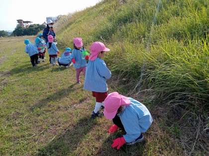 幼稚園から大和川まで歩いて虫取りに行きました。大和川には広い芝生が広がっており、幼稚園では見ない虫もいました。「あ!バッタがいた!」と素早く虫を捕まえる子どもや友達に虫を捕まえてもらい嬉しそうにしている子どもの姿などが見られました。大和川の広い空間で、子どもたちは夢中になって虫を探したり、ネコジャラシの草を摘んだりし、あっという間に時間が経ちました。