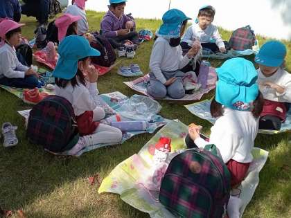 大和川で虫取りをした後は、近隣にある川辺小学校の芝生でおにぎりを食べさせていただきました。小学校で休憩させてもらいパワーを回復して、幼稚園まで歩いて帰ってくることができました。