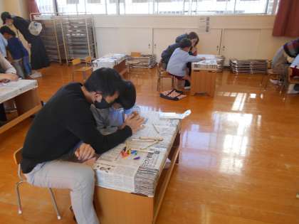 音楽会後は、子どもたちが、かいたりつくったりした作品を見て頂く「こどもフェスティバル」を実施しました。子どもたちは、保護者の方に「見て見て!」や「これは○○やねん」などと、自分なりにつくったものを説明しようとしたり、友達の作品のことも紹介したりしていました。子どもたちはかいたりつくったりする中で、どうしたら思うようにできるのか何度も試したり、友達と一緒に考えたりして取り組んできました。保護者の方につくったものだけでなく、子どもたちの試行錯誤してきた様子を知っていただけたことで、子どもたちの育ちを感じていただくことができました。また、子どもたちの自信につながったように感じます。
