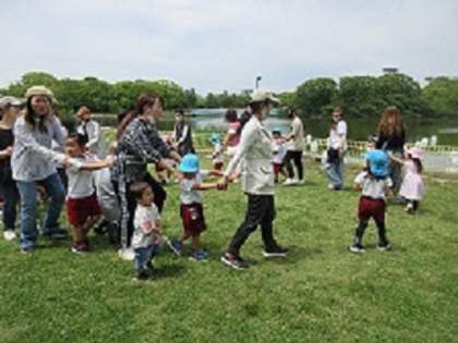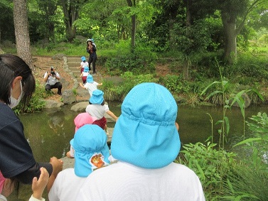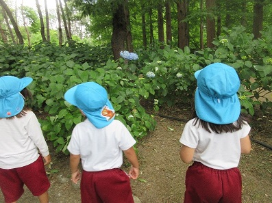 親子園外保育で長居植物園に行きました。おうちの人と一緒に体を動かして遊んだり、植物園でオリエンテーリングをしたりしました。お弁当を食べた後は、子どもたちと先生だけで、植物園の探検に出かけました。アジサイ園で様々な色や形のアジサイを見たり、川にある飛び石を渡ったりしました。探検に出かけた子どもたちは、松ぼっくりやメタセコイアなどの木の実をおうちの人へのお土産に持ち帰り、嬉しそうに見せていました。園にはない自然に触れ、他の親子とも顔や名前を知り、ふれあいを楽しみました。