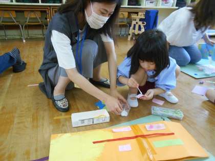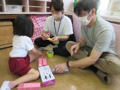 保育参加で、子どもたちはおうちの人と一緒にかいたりつくったりすることを楽しんでいました。そら組の子どもたちは、素材を組み合わせて自分がつくりたいものをおうちの人に伝えたり、一緒に考えたりしながらつくっていました。電車が大好きなもも組の子どもたちは、自分の電車の飾り付けをおうちの人と一緒にして、一人一人の素敵な電車ができていました。保護者の皆様が子どもたちの思いを受け止め、支えてくださったことが、子どもたちの一緒につくることができた嬉しさにつながったように思います。