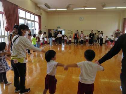 その後には、おうちの人たちと一緒に体操をしたり、ふれあい遊びをしたりして、体をいっぱい動かして遊びました。子どもたちも、おうちの人も楽しそうな表情を見ることができ、嬉しく思っています。園の行事を通して、子どもたちだけでなく、おうちの人同士のつながりを今後も大切にしていきたいと思っています。