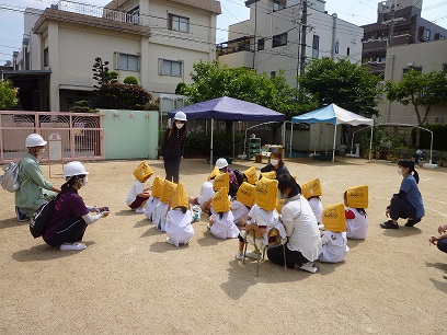 4歳児もも組は地震の際の避難訓練は初めてでしたが「机の下に入ってダンゴムシさんみたいに丸くなって頭を守るよ」と知らせるとみんな落ち着いて自分の頭や体をしっかりと守っていました。5歳児そら組は何度も繰り返し経験しているので、落ち着いて安全に避難していましたよ。引渡訓練では、保護者の方も協力してくださり、スムーズに子どもたちを引き渡すことができました。災害が起こったときに安全に避難できるよう、あらゆる災害を想定し定期的に避難訓練を実施していきたいと思います。