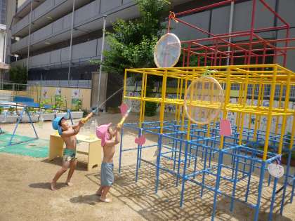 「冷たーい」「水鉄砲、高いところまで届いたよ!」「(スーパーボールが)たくさんすくえたよ」と園庭では、水の心地よさを感じながら、水鉄砲やスーパーボールすくい、魚釣りなどで子どもたちは元気いっぱい遊んでいます。