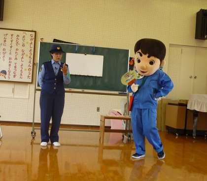 大阪府警と平野警察の生活安全課の方が来てくれ、子どもたちと保護者に防犯指導をしてくださいました。“ゆうかいするぞうさん”に公園やスーパーなどで、一人でいる子どもが誘拐されやすいと教えてもらいました。また、「お菓子あげる」と誘われたり、「困っているから助けてほしい」と子どもの優しい気持ちを利用する人もいるということなどを教わりました。「知らない人についていかないこと」や、困った人を助けてあげたい優しい気持ちは大切に、そんな時は「大人の人に知らせること」など、警察の方と約束をしました。参加してくださった保護者の方とも子どもの安全について考える機会となり、保護者の方とともに、これからも子どもたちの安全を守っていきたいと思います。
