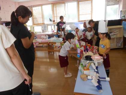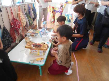 研究主題を受けて、「自園で捉えた人と関わることを楽しむ姿」について教職員で共通理解をし、子どもたちの興味や関心に応じて、子どもたちと共に遊びの環境を考えてきました。ステージごっこやレストランごっこ、素材を組み合わせてつくる場などで子どもたちが、人と関わることを楽しめるように働きかけを工夫しました。普段は少人数で過ごしていることから、たくさんの先生方が来てくださったことに緊張を感じた子どももいましたが、私たち自身も子どもたちにどのように援助すれば、人と関わることを楽しむ幼児の姿につながるのかを考え、多くの先生方からご意見を頂き、指導主事の先生からもご指導を頂き、学びを得る機会になりました。今後も、子どもたちのために、私たちの資質向上に努めていきたいと思います。