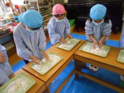 おもちつき当日は、かまどからモクモクでる煙を見たり、蒸しあがったもち米をみたりして、「ゆげが出てる」「ごはんの匂いがする」と嬉しそうに話していました。保護者の方にも手伝ってもらい、「よいしょ」「よいしょ」の掛け声に合わせてお餅をついたり、幼稚園の鏡餅をつくる様子を見たりしました。その後、子どもたちは、数を数えながらおもちつきを体験し、鏡餅づくりをしました。出来立てのお餅を手にとり、「やわらかいな」「見て見て、こんなにのびたよ」とちぎったり、のばしたり、丸めたりして、お餅の感触を楽しみながら、かわいらしい鏡餅ができあがりました。
